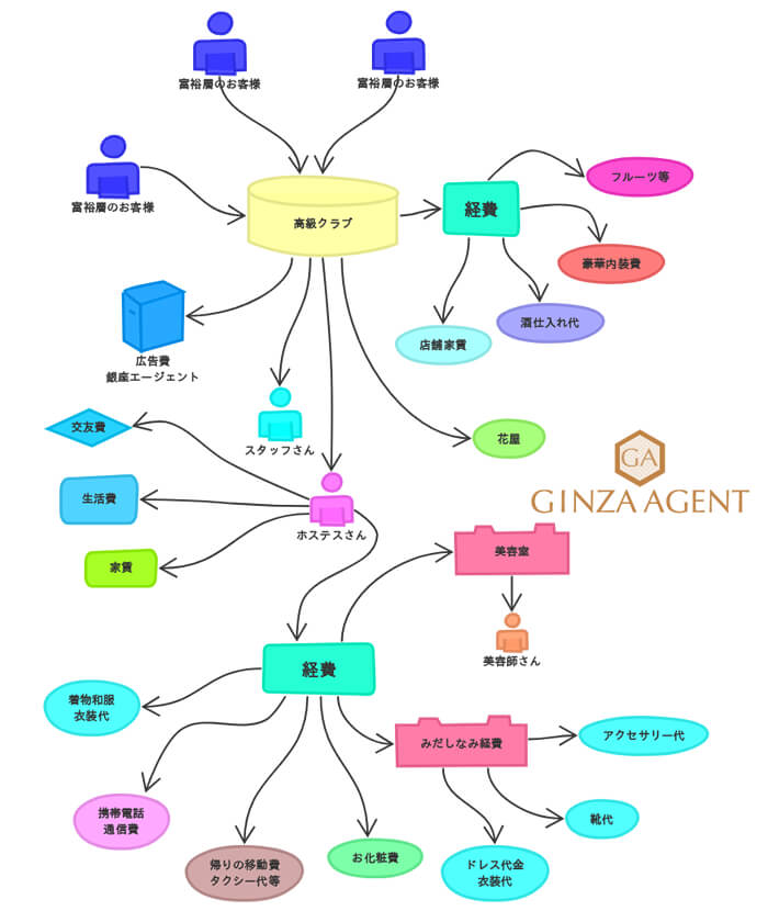 銀座で接客業をしているホステスさんの経済活動に関わっている業種の一部を挙げてみたいと重います。