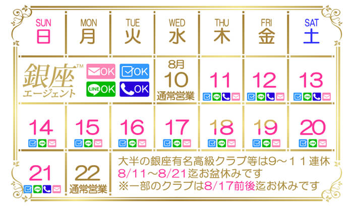 銀座の会員制高級クラブをはじめとする各高級店のお盆休みの期間は?