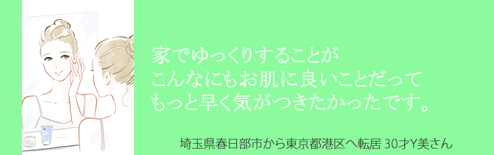 家でゆっくりすることが、こんなにもお肌に良いことだってもっと早く気がつきたかったです。と語ってくれたY美さん。