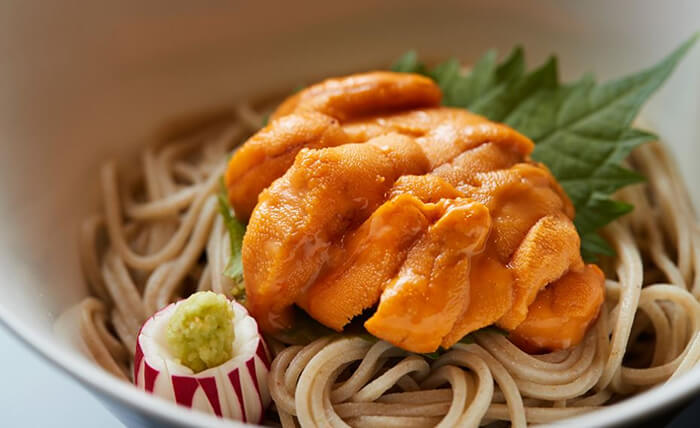温かいお蕎麦の「カレー南蛮蕎麦」、冷たいお蕎麦には「うに蕎麦」、特に「うに蕎麦」は他店では決して出会えないであろう逸品で、うにがお好きな人は是非ともお召し上がりいただいて、素敵な気持ちに酔いしれていただければと思います。