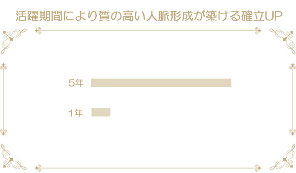 たとえば22歳からナイトワークを始めた女性が、よちよち歩きの新人期間を越え、5年間をしっかりと働いた結果、お金は必ずついてきます。そればかりかベテランホステスとして安泰と呼べるポジションで不動の地位をすごすことになります。これはお客様との信頼作りにも大きく影響します。つまり不動の信頼関係は「友好関係×期間=信頼関係」を計算が成り立ちます。