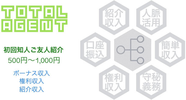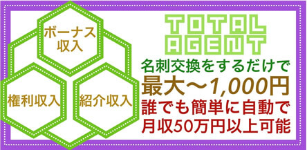 トータルエージェントはとてもユニークな紹介料システムを構築しています。最初は少額かもしれません。しかし収入の流れは次第に大きくなるでしょう。あなたの活用しきれなかった人脈の一部がどんどんお金に生まれ変わってゆくことが楽しくなるに違いありません。