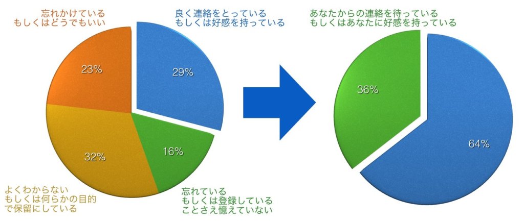 普段何気なく使っているあなたの携帯電話には統計によると平均321件もの連絡先が登録され、おもしろいことに全く連絡を取っておらず忘れかけてる知人の電話番号が統計によると平均約183件が大切に保管されており、この平均約175件のうち平均約65件があなたからの連絡を待っているという統計が出ています。あなたはこのまぎれもない統計による事実を信じられますか?